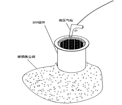2.使用空氣壓縮機(jī)(或者別的壓縮空氣源,壓力>0.6MPa)的高壓氣體和高壓槍,對(duì)DPF組件的出氣端均勻吹氣,把積沉在陶瓷慮芯中的金屬、粘土等不能被氣化的顆粒反吹,直到?jīng)]有顆粒吹出為止。